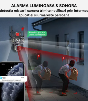 Camera de supraveghere 8MP, 2 lentile, 4G Cartela SIM 4K, Control din aplicatie, Urmarire automata, Rezistenta la apa IP66, intelligent tracking, PTZ, Micro SD, Alarma miscare, microfon