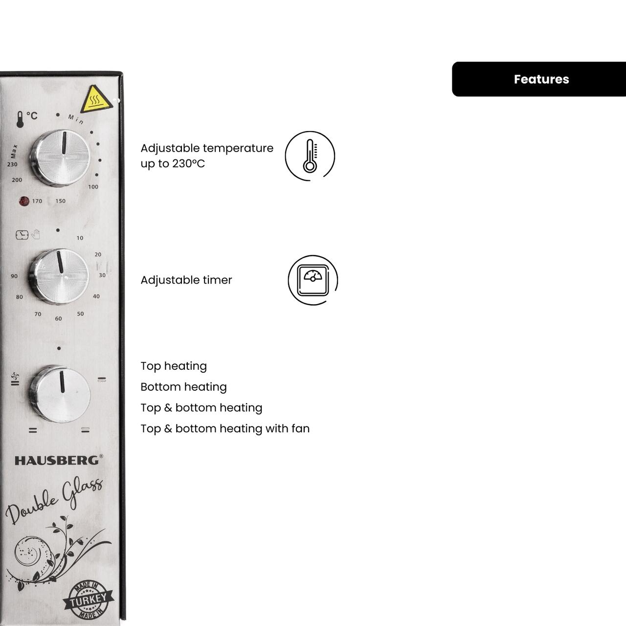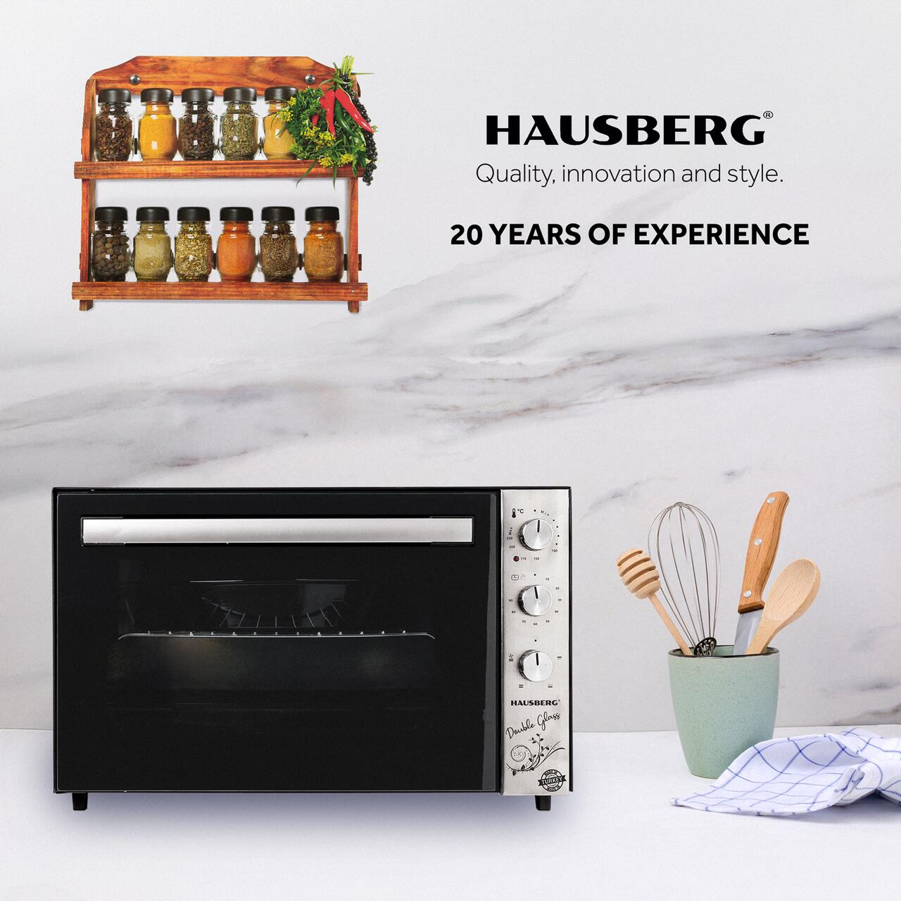 Cuptorul electric Hausberg HB-8020 este usor de folosit si contine o serie de caracteristici ce iti vor usura munca, indragindu-l astfel inca de la prima utilizare. Atat temperatura cat si optiunile de incalzire pot fi reglate. Multumita temperaturii presetate constante, acesta reduce considerabil timpul de coacere gatind astfel mult mai rapid preparatele tale preferate.