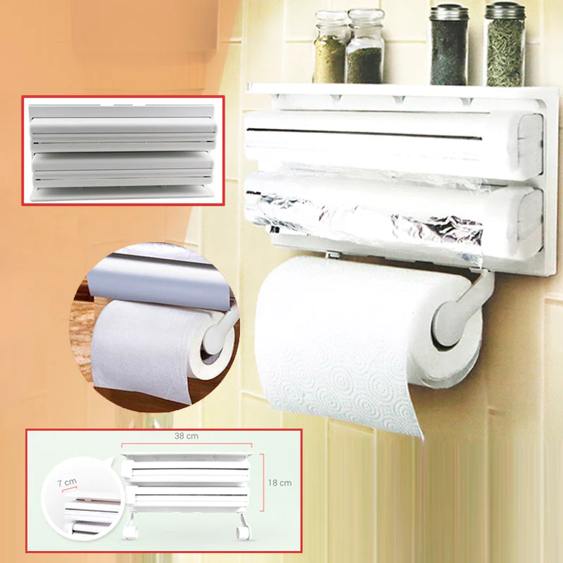 Utilizandu-l, nu numai ca economisiti extrem de mult spatiu, dar economisiti si timp, datorita sloturilor multiple de depozitare, a hartiei, a prosoapelor sau a foliei de aluminiu, toate acestea, fixate intr-un singur loc, pentru ca de fiecare data sa ai la indemana necesitatile. Mod de utilizare: Acest dispenser triplu, se fixeaza foarte usor pe diverse suprafete, precum frigiderul, mobilierul de bucatarie, pe perete sau oriunde doriti dumneavoastra si oriunde va este mai la indemana.