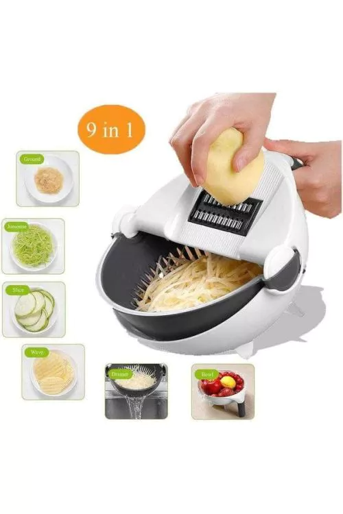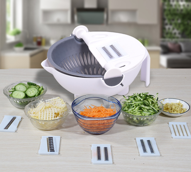 Feliator de legume cu strecuratoare va deveni ajutorul preferat in bucatarie. Feliati legumele sau fructele in conformitate cu ideile si cerintele dumneavoastra. Puteti alege unul din 5 atasamente diferite care pot fi inlocuite cu usurinta. Legumele si fructele pot fi clatite imediat cu ajutorul strecuratorului rotativ, in care legumele feliate cad drept. Sunt incluse o protectie pentru degetele pentru o siguranta maxima si un decojitor de legume. Legumele decorate pe o farfurie vor incanta nu numai iubitorii de mancare.