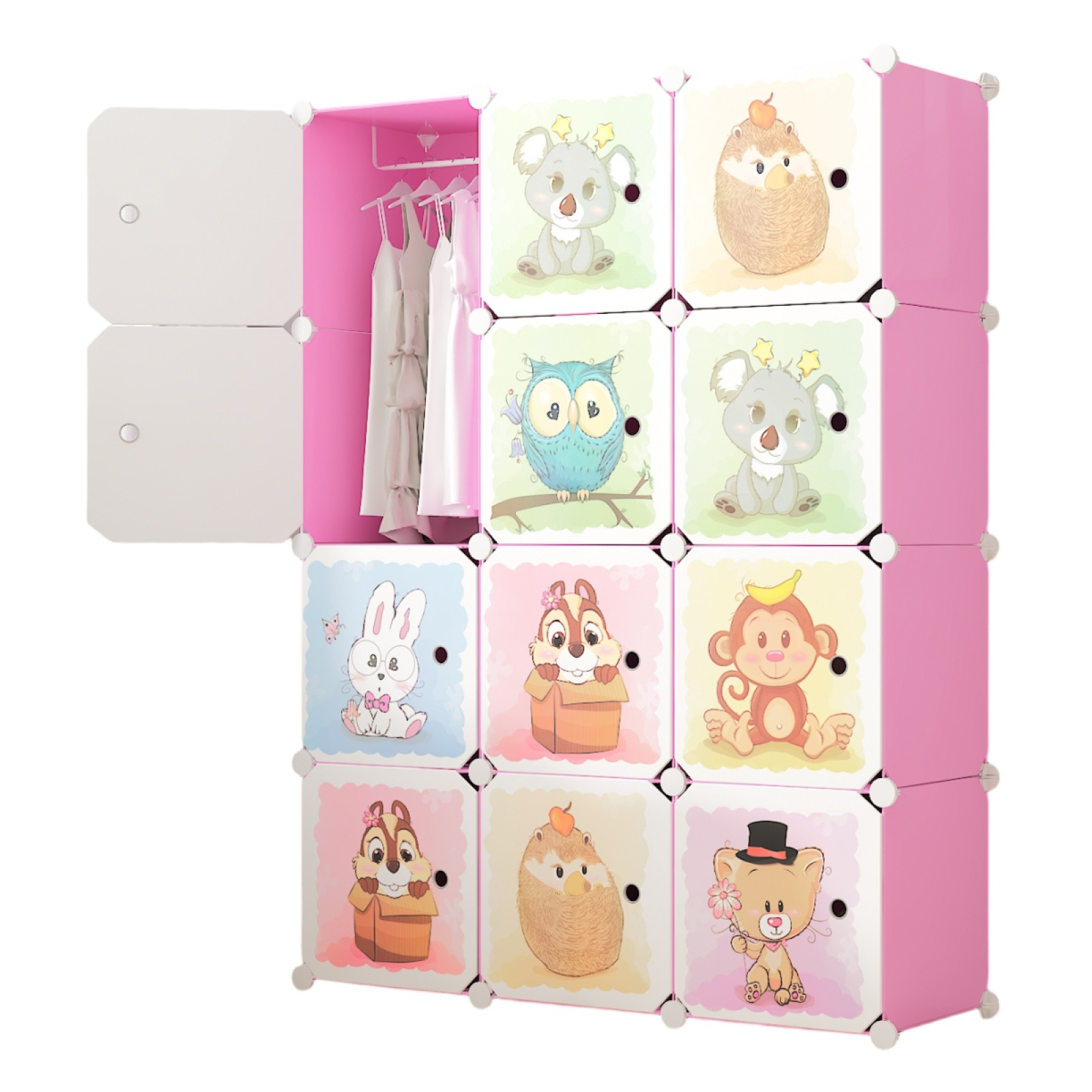 Dulap modular pentru copii, 12 rafturi, durabil, 76X37X147 cm, roz, animale