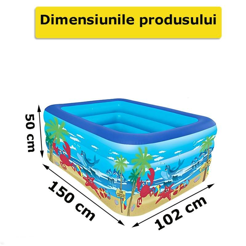 Piscină gonflabilă pentru copii, exterior / grădină, cu bază moale, 150 x 102 x 50 cm, 3 inele, dreptunghiulară, multicolor