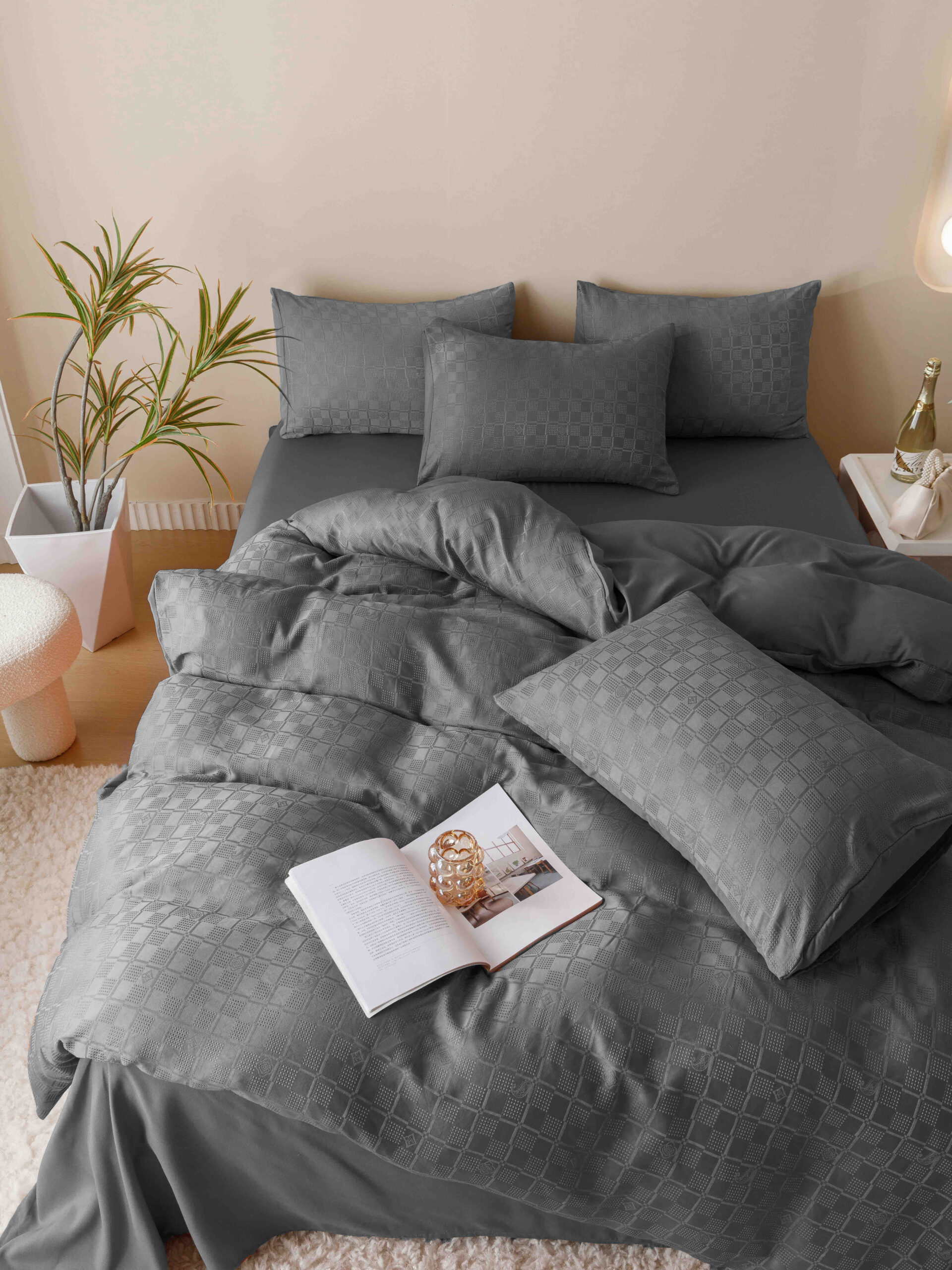 Lenjerie De Pat, 2 Persoane, 6 piese, din Jacquard Finetat, Gri Inchis